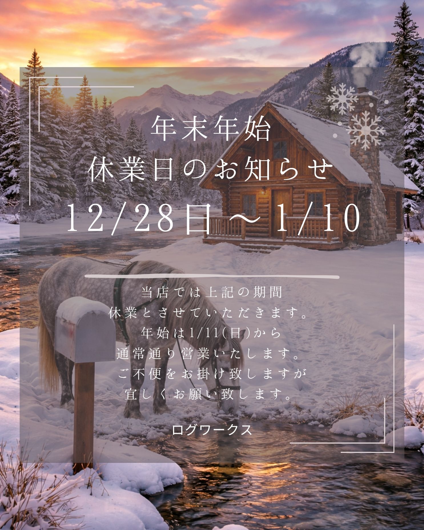 年末年始の営業のお知らせ2025年12月27日平素は格別のご愛顧を賜わり、厚くお礼申しあげます。本年中は格別のお引き立てを賜り、誠にありがとうございました。2026年もログワークスをよろしくお願いいたします。ログワークス鹿児島空港展示場の年内の営業は12月27日(土)まで、年明けは1月11日(日)より営業開始となります。お間違えのないようによろしくお願いします。 前の投稿小冊子「後悔しない薪ストーブ選び・これだけ読めば大丈夫」無料配布のお知らせ